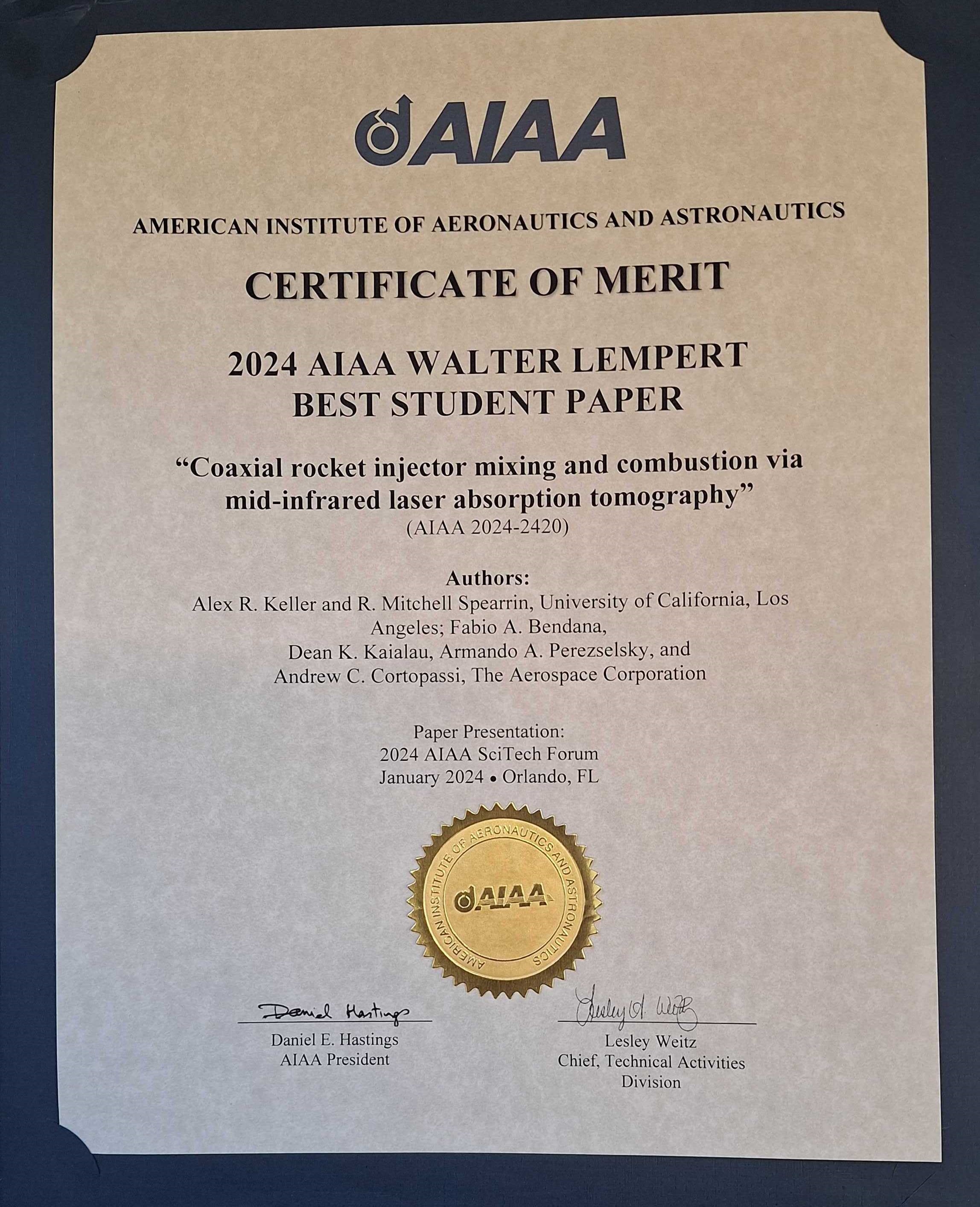 Keller, A. R., Bendana, F. A., Phong, V. C., & Spearrin, R. M. (2024). Additively-manufactured shear tri-coaxial rocket injector mixing and combustion characteristics. Aerospace Science and Technology., 155. https://doi.org/10.1016/j.ast.2024.109680